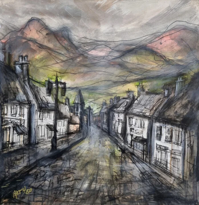 This 60 x 60 cm expressionist piece captures an Irish village street under a dramatic sky. I combined acrylic washes with charcoal to evoke the wet pavement and white-washed buildings. There’s a slight texture lift on the left side that shows the mixed media quality. Light catches on the slick surface, enhancing the overall ambiance. A hand-painted original with rich depth you'd need to experience in person. I painted this piece on a gloomy day, inspired by the quiet beauty of rural life. This 60 x 60 cm artwork would create an inviting atmosphere above your living room sofa. Ideal for anyone who loves stories told through landscapes. Ready when you are.