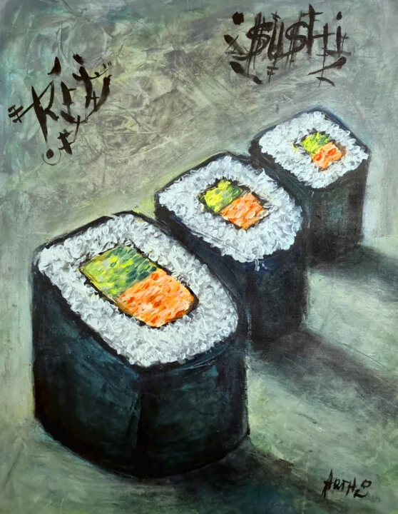 This 40 x 50 cm acrylic piece features stylized sushi rolls against a muted backdrop. I aimed for a playful yet thought-provoking composition, using bold colors and graphic shapes. The dollar sign in the title brings humor and commentary on consumer culture. There's a faint brushstroke where I added too much paint on the edge of one roll. Light interacts with the smooth surface to enhance the vibrant hues and textual elements. Hand-painted original with a unique twist. I painted this while thinking about how food trends affect our choices. This 40 x 50 cm artwork would spark conversations in your dining area or kitchen. It's perfect for anyone keen on modern art that challenges perceptions. Here if you need it.