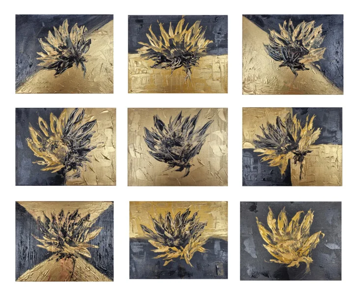 This large-scale 75 x 60 cm acrylic piece consists of nine individual panels, each 25 x 20 cm, creating a customizable sunflower matrix. I blended luxurious gold and deep black tones to generate striking contrast. Each panel features a unique arrangement of sunflower petals, with a slight paint drip on one corner showcasing its handmade quality. The arrangement of light across the panels adds depth and intrigue. Hand-painted original that invites personal arrangement. I created this installation to celebrate the beauty of modular art. This 75 x 60 cm piece would be stunning in a spacious entryway or modern office, allowing you to arrange it as you like. Ideal for collectors who appreciate contemporary, interactive art. Here if you need it.