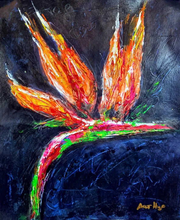 In this 40 x 50 cm painting, vibrant oranges and yellows explode from a deep black background, depicting a Bird of Paradise emerging from darkness. The thick impasto technique creates a sculptural effect in the petals, while subtle graffiti-like marks in the negative space add an urban feel. There's a small dent on the upper right where the paint didn't settle perfectly, which gives it character. Light catches the texture, making the blooms seem alive. Hand-painted original with a striking surface. I painted this piece during a rainy afternoon, inspired by the resilience of nature. This 40 x 50 cm artwork would brighten up the wall above a cozy reading nook. It's perfect for anyone who appreciates bold floral art with a modern edge. Here if you need more info!
