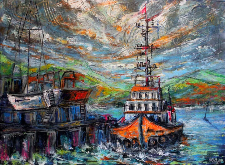 This 100 x 75 cm acrylic painting portrays a rescue vessel in Westport Harbor, rendered with swirling brushstrokes that depict a dynamic sky. I used vibrant orange for the ship, and there's a small smudge on the hull where I accidentally brushed my hand against it. The interplay of light on the water creates a rich depth that draws you into the scene. Hand-painted original celebrating maritime heritage. This piece captures the strength and tranquility I felt while visiting the harbor, standing in awe of its history. This 100 x 75 cm artwork would be ideal for a coastal home or office, grounding your space in nautical charm. Ready when you are.