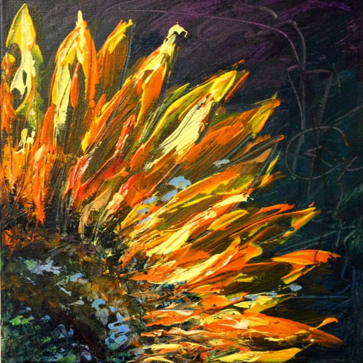 This dynamic 30 x 30 cm artwork captures the upper right quadrant of a radiant sunflower. The heavy impasto creates depth, with fiery yellows contrasting against a mysterious violet background. There's a slight texture from paint drips that adds character. The light highlights the curves of the petals, creating depth and inviting interaction. Hand-painted original with a vibrant texture you'll love to explore. I painted this piece to celebrate the vitality of flowers in bloom. It fits beautifully in any cozy reading nook or as part of a gallery wall. This 30 x 30 cm artwork is perfect for anyone who appreciates lively floral interpretations. It's a daily reminder of nature's beauty. Here if you need it.