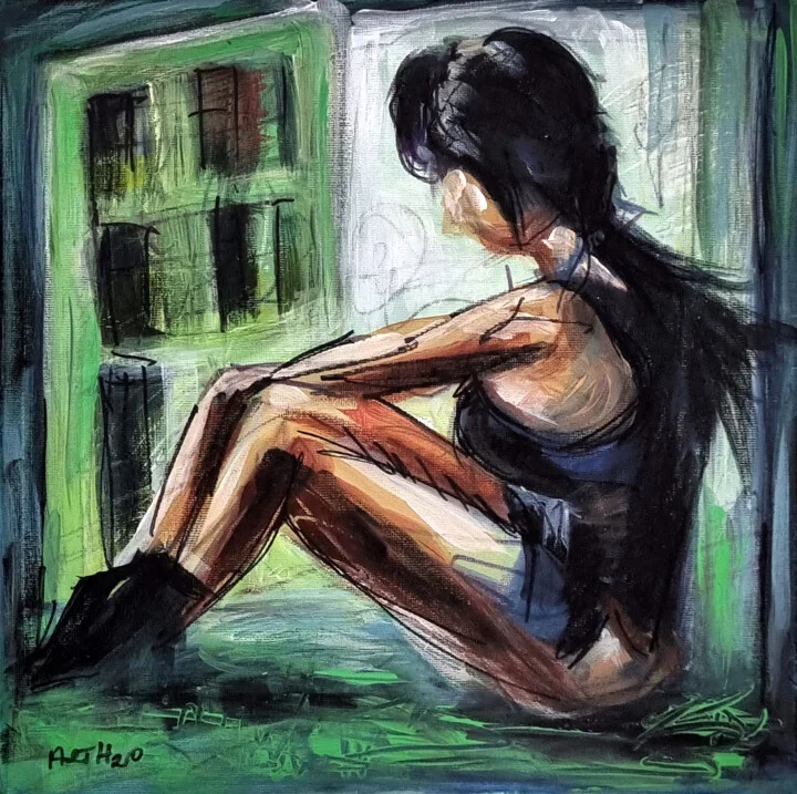 Original title: Urban Window Gazer, Moody Acrylic Figure Painting