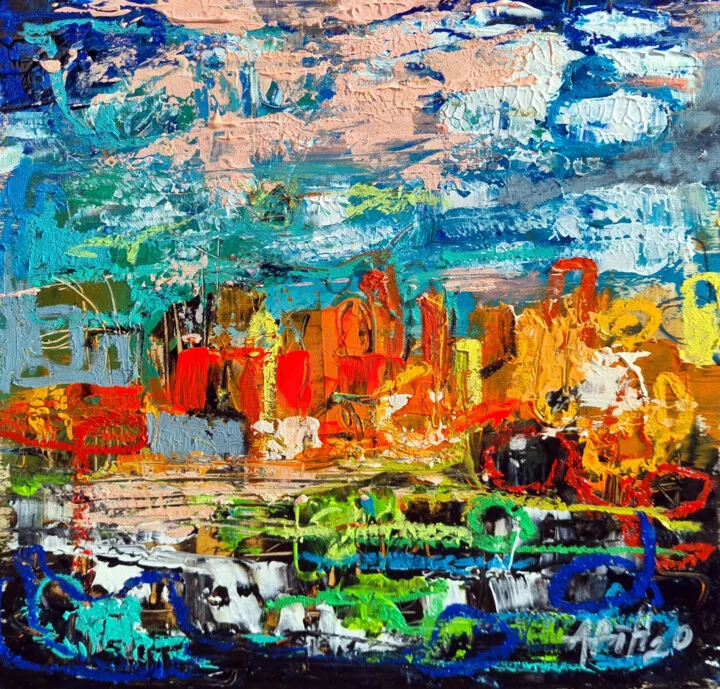 This 30 x 30 cm artwork bursts with thick, impasto layers of azure and fiery orange, sculpted on plywood. Using a palette knife, I carved out bold cloud-like shapes, while the base features darker green strokes that anchor the skyline. There’s an imperfect edge in the upper right where the paint lifted slightly, revealing the wood underneath. Light dances across the textured surface, creating shadows that shift as you move. Hand-painted original that invites a tactile experience. I painted this piece during a bustling summer evening, inspired by city lights against the twilight. This 30 x 30 cm artwork would brighten a compact urban apartment, adding a splash of energy above a cozy couch. Perfect for anyone who loves capturing the vibrant rhythm of city life. Here if you need it.