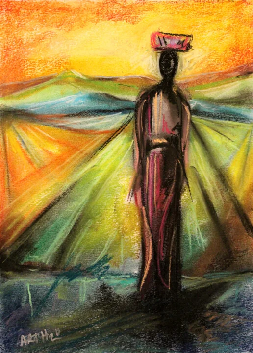 In this 29.70 x 42.00 cm mixed media painting, a dark silhouette of a woman carries a pack against a backdrop of vibrant sunset colors—glowing yellows, greens, and fiery oranges. The rich texture comes from layers of pastel over solid acrylic, and I noticed a slight ripple in the paper, adding to its organic feel. Light plays across the surface, enhancing the sunset's warmth. Hand-painted original that tells a story. While creating this, I thought of the resilience required to secure the essentials in life. This piece would perfectly adorn a study or professional office, ideal for someone who appreciates narratives of strength. Ready when you are.