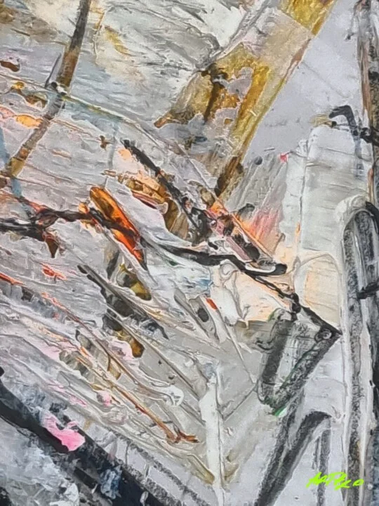 The 21 x 29.7 cm canvas is alive with robust strokes of white and grey, interlaced with warm ochre and hints of orange. I applied thick layers of paint with a palette knife, and you'll find a slight imperfection where my hand smudged the wet paint. The light dances on the layered textures, creating shadows that enhance its depth. Hand-painted original with texture that invites close viewing. While painting this, I was immersed in thoughts of city life. It would make an impactful statement in a modern living room or a chic office, drawing the eye instantly. This 21 x 29.7 cm artwork would enhance your urban loft's style. It's for those who appreciate contemporary themes in their decor. Here if you need it.