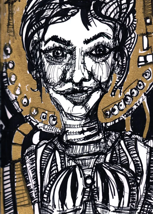Measuring 14.8 x 21 cm, this ink drawing showcases an expressive portrait against a luminous gold backdrop. Bold black lines create the detailed hair and clothing of the 'cheerful girl,' capturing her distinct personality. I’ve added stylized forms that float around her head, enhancing the energy of the piece. A subtle ink bleed appears where thicker lines meet the gold, adding a handmade charm. The reflective gold contrasts beautifully with the matte black ink, creating a dynamic visual interplay. Hand-drawn original full of raw energy. I started this piece on a quiet afternoon, reflecting on how a smile can conceal complex emotions. This drawing would bring intriguing character to a small gallery wall or a curated shelf display. It's for anyone who values the expressive quality of line art and enjoys a hint of metallic flair. Let her add a spark to your space.