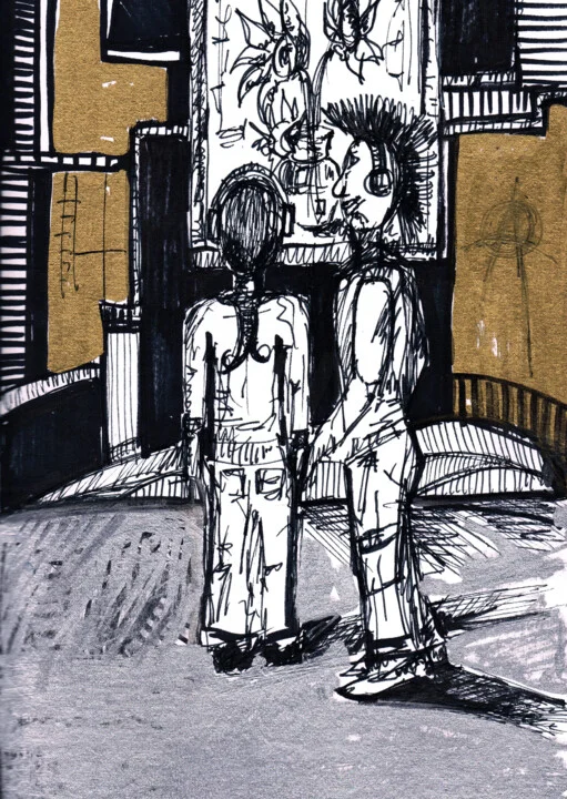 Two figures emerge against a deep black backdrop with striking gold accents in this 21 x 29.7 cm drawing. A faint scratch on the left side adds a raw edge that feels spontaneous. Using a fine liner, I emphasized their contours—look closely and you'll notice the lines dance around their heads. Light glints off the gold, illuminating the vibrant essence of urban life. It's a hand-drawn original with a texture that captures the energy of conversation. I sketched this after an inspiring night out, feeling the city's pulse around me. It brings a sense of connection and vibrancy. This 21 x 29.7 cm piece would add character above a trendy sofa in your living room. It's perfect for those who appreciate expressive art. Let this remind you of the moments that matter.