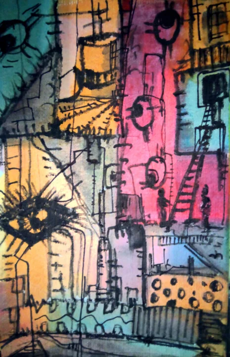 A vibrant interplay of pink and teal defines this 14.8 x 21 cm piece, capturing the essence of an urban landscape. The soft watercolor bleed adds a handmade touch, while bold black ink outlines give structure. There's a light smudge in the bottom corner marking my hand's presence during painting. The colors flow together, inviting thoughts of city life, and the texture catches the light beautifully. Hand-painted original that reveals its charm when viewed up close. I sketched this during a bustling afternoon, inspired by the city’s rhythm. The energy resonates with anyone who appreciates urban scenes. This 14.8 x 21 cm sketch would fit perfectly in a modern office space, bringing creativity to the atmosphere. Ready when you are.