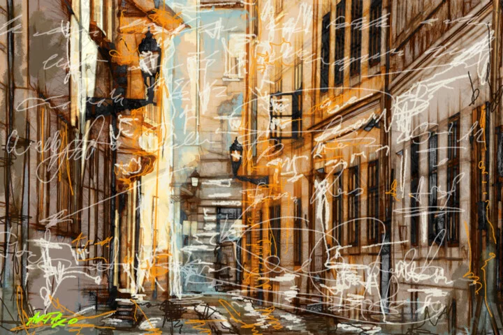 This vibrant 38 x 30.5 cm digital artwork is filled with warm amber tones that bring a lively street scene to life. I layered soft yellows and browns, creating a playful illusion of light dancing off the old architecture, with hints of turquoise peeking through. A unique touch is the handwritten scripts woven throughout, adding a nostalgic feel. You might even notice a small smudge where I accidentally brushed the screen. The light catches the textures beautifully, making it a hand-painted original, perfect for printing. On one of my walks through historic streets, I felt inspired to encapsulate that warmth and liveliness. This 38 x 30.5 cm piece would add storytelling charm above your cozy reading nook. It's perfect for anyone who cherishes nostalgia in their decor. Ready when you are.