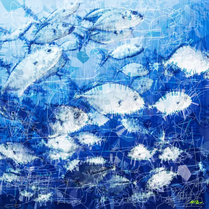 Swirling cerulean and azure shades fill this 63.5 x 63.5 cm digital canvas. I created this piece with sweeping brushstrokes that give movement to the school of fish, each shimmering with silver tones. You'll notice a slight pixelation in the lower left where I blended colors too quickly. Light dances across the surface, highlighting the textures and revealing layers beneath. It's a print-ready file with a depth you'd appreciate in any medium. This piece takes me back to my adventures exploring coral reefs—it's both calming and thrilling. This 63.5 x 63.5 cm artwork would make a stunning statement above your home office desk. Ideal for anyone who cherishes ocean life and wants to add a tranquil touch. Ready when you are!