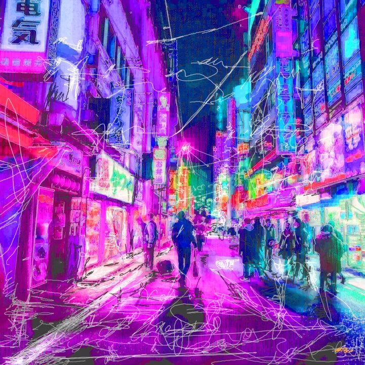 A lively urban street unfolds in vibrant magenta, electric blue, and glowing teal across this 76.2 x 76.2 cm digital canvas. I layered hand-drawn white lines over the scene, which adds a whimsical touch amongst the bustling activity of the city. You can spot a faint smudge in the corner where my hand brushed against the screen while working. The bright colors reflect light beautifully, creating a kaleidoscope effect that invites viewers to dive in. Hand-crafted digital artwork that brings a pop of color to your walls. This piece was inspired by late-night strolls through city streets, illuminated by neon lights. It captures a lively urban spirit. Print this 76.2 x 76.2 cm digital piece on sleek metal for an eye-catching addition to your modern home office. It’s perfect for anyone looking to add energy to their space. I'm excited for you to bring this to your collection!