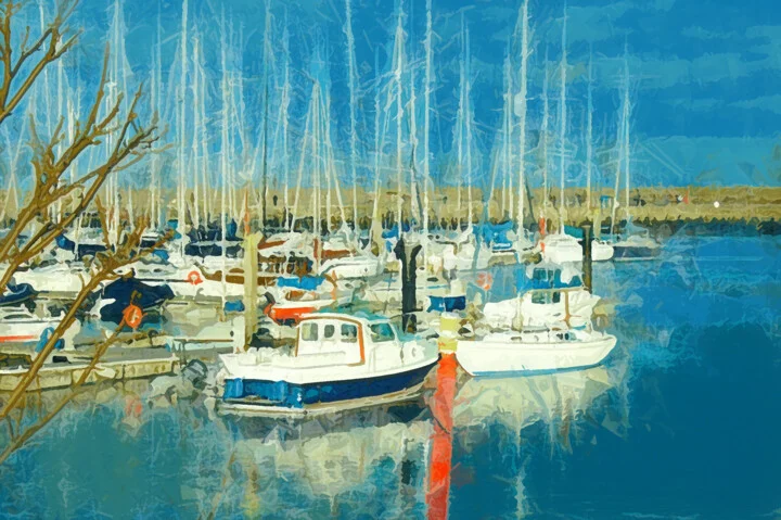 This tranquil marina scene showcases soft greens and cerulean blues across a 22.9 x 15.2 cm canvas. I employed gentle layering effects to emphasize the depth and texture of the boats, and you can see a slight lift in one corner where the paint didn't quite adhere. The light dances on the water, creating reflections that invite a sense of calm. A hand-crafted digital art piece that radiates serenity and charm for your home. Inspired by a sunny day at the marina, I aimed to encapsulate a relaxing atmosphere in this artwork. This 22.9 x 15.2 cm print would look lovely in your kitchen or hallway, bringing a touch of coastal serenity indoors. It's perfect for anyone looking to enhance their space with a peaceful vibe. Ready when you are.