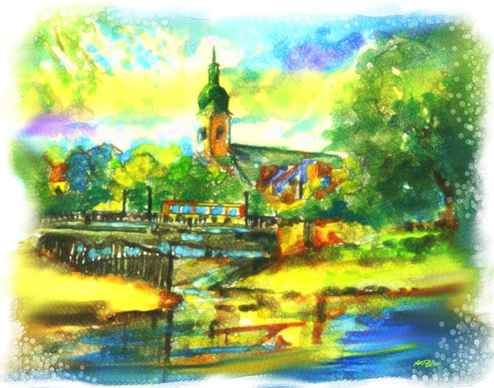 In this 76.2 x 55.9 cm digital art piece, lively yellow and green hues merge to form a picturesque landscape. My layering technique brings depth, especially where sunlight glistens on the water's surface below the tall church steeple. The composition feels alive, with light enhancing its shimmering energy. A few brush strokes sit unevenly, showcasing the handmade quality. This print-ready file is ideal for canvas, fine art paper, or metal without losing clarity. This artwork was inspired by a peaceful afternoon stroll in a sunlit village. It evokes a serene feeling, bringing warmth to any room. Print this 76.2 x 55.9 cm piece above your sofa as a vibrant conversation starter. It’s for anyone wanting to add a splash of joy to their decor. I’d love for you to welcome this original piece into your home.