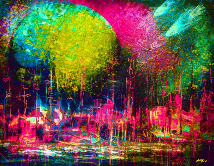 This digital piece showcases an electric mix of pink and bold green, forming a fantastical alien cityscape. I played with textures to add depth, and there's a small blemish on the top edge where I adjusted colors too quickly. Light dances across the luminous orbs, casting playful shadows and creating an inviting atmosphere. This high-resolution digital file can be printed beautifully on metal or canvas. Inspired by dreams of strange planets, I wanted to capture that exhilarating essence. This 76.2 x 58.4 cm artwork would bring a whimsical spark to your game room wall. It’s tailored for anyone who enjoys vibrant art that tells a story. Ready when you are.