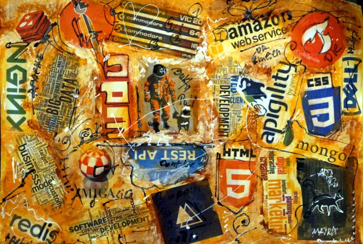 This 29.7 x 21 cm collage bursts with rich burnt sienna tones layered against various logos and texts. I noticed some lifted edges from the paper layers over time that give it character. There’s a faint smudge across the center from when the adhesive met the ink, reminding me of the vibrant process. Glossy patches catch the light beautifully, giving the piece a dynamic urban feel. Hand-crafted original that radiates energy, perfect for enlivening any space. I started this on a sunny afternoon when everything felt electric outside. It captures the essence of urban nostalgia. This 29.7 x 21 cm collage would make a lively focal point above your workspace desk. Ideal for tech lovers or design enthusiasts. Come find a spot for it!