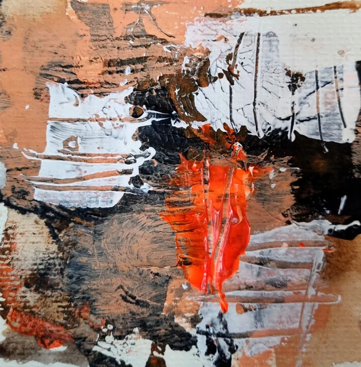 Swirls of burnt orange mix with deep black across this 10 x 10 cm paper. I used a brush to create bold lines, and there's a faint smudge in the bottom left where my hand brushed against the wet paint. The thick texture catches the light beautifully, revealing a depth that draws you in. Each layer feels alive, showcasing earthy tones that invite exploration. Hand-painted original with a tactile quality that you'd appreciate in person. I started this piece on a warm summer afternoon, inspired by glowing sunsets. It radiates warmth and energy, perfect for a cozy nook in your home office. This 10 x 10 cm abstract is for anyone who appreciates textured art that sparks joy. Let it find its place in your space.