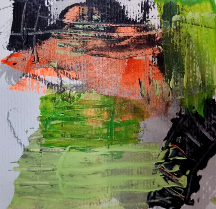 Dynamic strokes of neon green collide with bold orange in this 10 x 10 cm acrylic piece. The paper has a subtle lift in the bottom corner, a little imperfection that adds character. The thick paint catches light, creating depth that varies with the smoother areas. Each brush stroke tells a story, revealing layers beneath. Hand-painted original with an irresistible texture that invites touch. I began this on a sweltering summer afternoon, inspired by vibrant landscapes. It has an electric feel that can spark energy in any room. This 10 x 10 cm abstract would brighten any small nook or workspace, turning it into a focal point. Ideal for those who appreciate lively art full of character. Come explore this piece and let it transform your space.