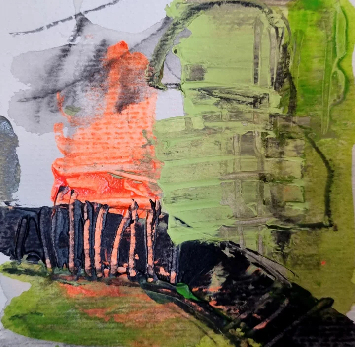 A striking contrast of bright greens and vivid oranges breaks across the 10 x 10 cm paper. A subtle smear of black runs along the bottom, where an intentionally faint stroke draws attention to the edges. My brush left a slight texture as it dragged along, while the glossy orange glows under the light, highlighting its thick application. This hand-painted original has textures that can only be experienced closely. I created this on a sunny afternoon, inspired by the vibrant flora of summer. The piece radiates energy and would brighten any small space. This 10 x 10 cm abstract would add a lively touch above a bedside table. It's perfect for anyone who enjoys color and whimsy in their art. Let's make your walls come alive!