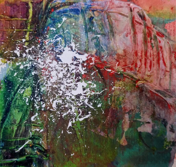 Lively layers of red and green interweave across this 10 x 10 cm piece, punctuated by dynamic white accents. There's a faint smudge of paint in the bottom left corner—evidence of my spontaneous process. The thick acrylic reflects light beautifully, enhancing the texture and revealing depth. The movement feels fluid and natural, while splatters of white add a burst of energy. This hand-painted original offers a tactile experience, inviting viewers to explore its rich surface. I began this during a lively summer storm—nature's chaos inspired my creativity. This 10 x 10 cm abstract would look perfect above a bedside table in a cozy nook. It's ideal for anyone seeking a touch of vibrancy in their space. Can't wait for it to brighten your collection!