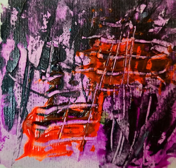 This 10 x 10 cm piece bursts with crimson and orange, layered over deep purple undertones. I applied ink using a flat brush, and there's an uneven stroke along the right where I got a bit too enthusiastic. A faint smudge hides on the surface, a reminder of my hand brushing against the wet ink. Under bright light, the orange glimmers, creating shadows that dance across the composition. Each geometric line cuts through the chaos, adding a structured feel. Hand-painted original with texture you'd want to explore up close. I painted this on a lazy summer afternoon when the sunlight flooded my studio. It radiates lively energy. This 10 x 10 cm abstract would make a colorful addition above a small desk or cozy reading nook. It's perfect for anyone looking to bring warmth and vibrancy into their space. Ready to add a splash of life to your home?