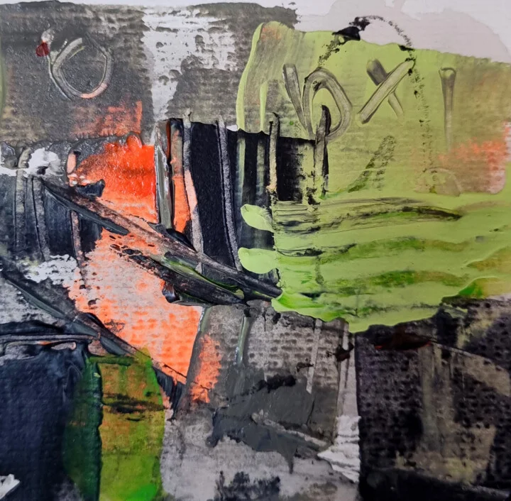 Lime green layers juxtapose against deep black and radiant orange in this dynamic 10 x 10 cm piece. A fine liner detail etched into the top left adds a faint texture, contrasting with smooth acrylic washes. A slight ink bleed at the edges creates unexpected depth, while vibrant colors catch the light beautifully, making the orange radiate against cooler tones. This hand-painted original captures moments of spontaneity, inviting exploration of its textured surfaces. I started this on a sunny afternoon when colors seemed to pop differently. It evokes playful energy and movement. This 10 x 10 cm abstract would bring life to the wall above a bedside table. Perfect for anyone seeking a lively art piece that inspires creativity and warmth. Ready to embrace your space?