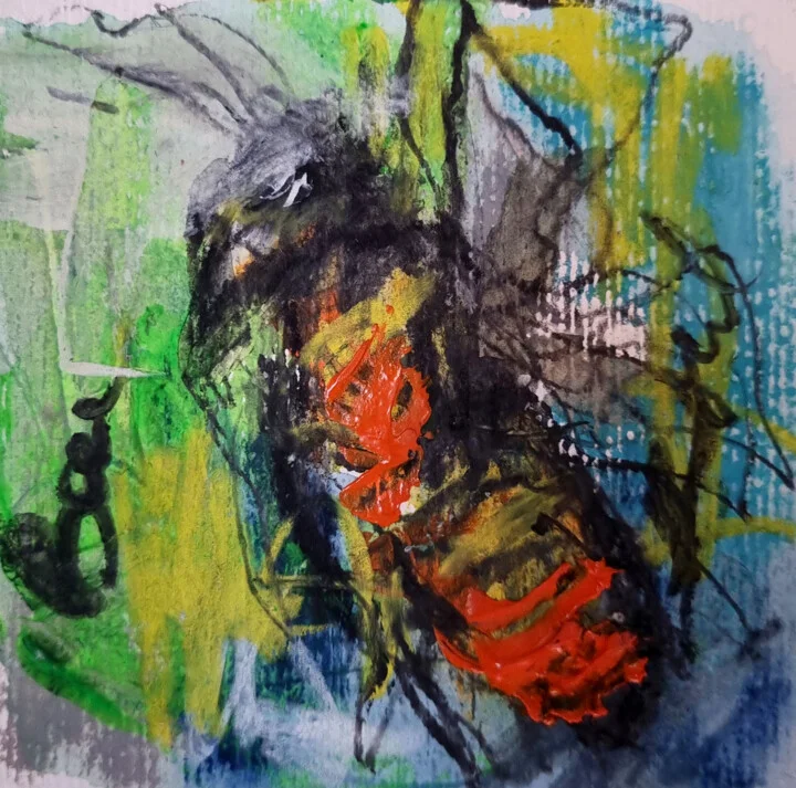Vibrant splashes of bright orange and lush greens collide in this 10 x 10 cm piece, creating a striking representation of an insect. The ink wash technique gives it a smooth and glossy sheen, while a faint smudge near the bug's 'head' brings back memories of warm summer days catching fireflies. Textured layers reflect light differently, adding depth. Thin black lines trace the contours of the insect’s wings, seamlessly blending into the background. Hand-painted original with unique nuances waiting to be discovered. This piece reminds me of summer nights spent outdoors, surrounded by buzzing life. Bursting with energy, this 10 x 10 cm abstract would bring life to the wall above a small desk in an artist's nook. It's perfect for those who adore nature-inspired art with a modern twist. I can’t wait for you to experience it.