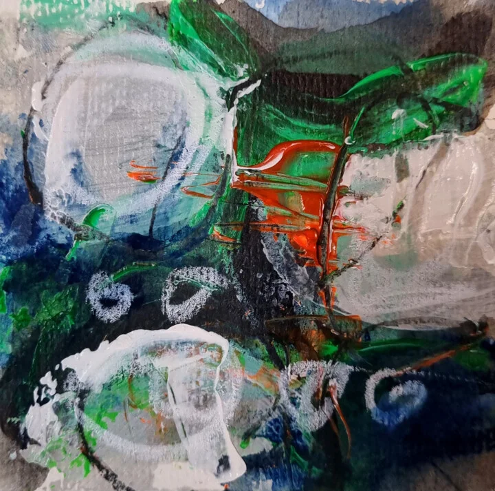 Swirling emerald greens blend with fiery orange and soft whites on this 10 x 10 cm paper piece. I noticed a faint smudge in the bottom left where my finger brushed against the wet paint, adding a personal touch. The glossy surface captures light beautifully, revealing layered textures that create a sense of depth. Distinct circular shapes stand out against the jagged backdrop, showcasing a playful chaos. This hand-painted original has a texture that invites you to explore it up close. I painted this on a sunny day, inspired by the joy of summer outdoors. This 10 x 10 cm abstract would bring a burst of happiness to the wall above a cozy reading nook. It's for anyone wanting to add a lively splash of color to their space. Let it spark your creativity.