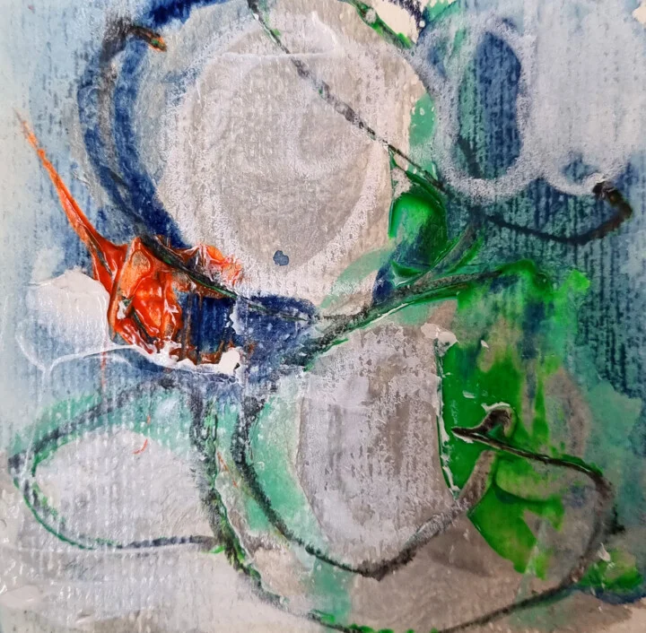 Swirls of green and gray intermingle with bold crimson across this 10 x 10 cm paper canvas. I pressed a bit too hard in one spot, causing an uneven edge - a reminder of my touch. The glossy red stroke captures light beautifully, enhancing its depth and drawing attention. Subtle silver undertones shimmer against the vibrant colors, while the shapes blend together in a lively dance. This hand-painted original carries a texture you'll want to experience up close. I painted this on a sunlit afternoon, inspired by the lively colors of summer. It radiates warmth and movement. This 10 x 10 cm abstract would add a lively touch above a bright kitchen nook. It's for anyone who enjoys art filled with spontaneous energy. I'm excited for you to connect with it just like I did.