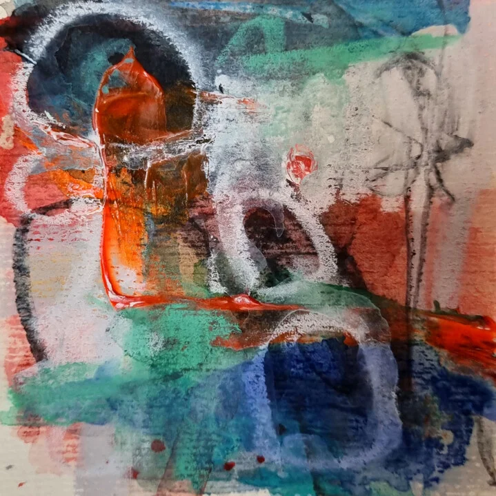 Crimson and teal swirl together with muted greens across this 10 x 10 cm paper piece. There's a faint smudge at the bottom left where the ink bled, adding a delightful depth. Light dances off the glossy patches, creating a vibrant contrast against the matte background. You can see prominent ink lines sketching organic forms, adding a dimensional quality. This hand-painted original showcases unique textures you'll appreciate in person. I began this during a sunny afternoon, letting the colors flow freely. It embodies playful chaos and energy. This 10 x 10 cm piece would make a striking focal point above a small desk. Perfect for anyone who loves vibrant, expressive art that inspires creativity. I'm here when you're ready to embrace it.
