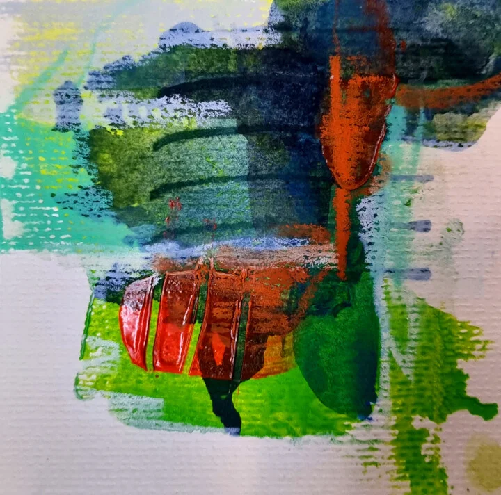 Vivid crimson stands out against fresh greens and deep blues in this 10 x 10 cm artwork. An uneven stroke at the top left reveals the textured surface underneath, while a subtle smudge in the center disrupts the flow. Light bounces off the thick reds, creating inviting warmth. The organic forms twist and turn, echoing nature's whimsy. This hand-painted original has textures you'll feel and see. The splash of red reminds me of fiery summer sunsets. The warmth of this piece would beautifully complement space above a cozy writing desk. It's perfect for anyone wanting to add life to their walls. I hope it brings vibrant energy into your home.
