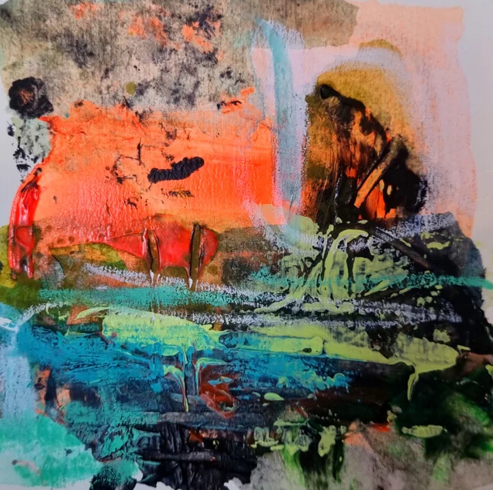 Crimson swirls blend with deep teal and vibrant greens, creating an abstract landscape across this 10 x 10 cm paper. An ink bleed near the top left adds handcrafted charm. Light catches on the thick paint, creating shifting shadows. The rough edges of brush strokes add depth to the piece. This is a hand-painted original, with texture only possible by hand. I started this on a warm summer day, inspired by the lively colors around me. This 10 x 10 cm abstract would add a burst of energy above a desk or on a small gallery wall. It's perfect for someone who loves vibrant, textured art that speaks to summer adventures. I'm excited for you to bring it home.