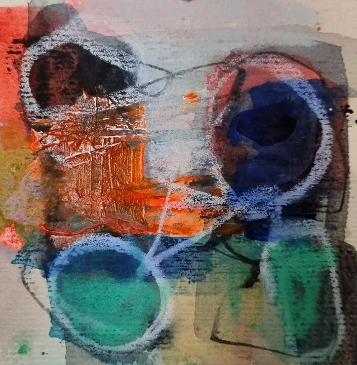 Crimson swirls dance with turquoise and deep blue across this 10 x 10 cm paper piece. I let my brush glide freely, creating an uneven edge in the bottom corner that beckons for touch. The layers reveal a light bleed, which captures the sunlight in a way that enhances the translucent washes. You can see some shapes floating while others ground the composition, adding to the delightful chaos. A hand-painted original with a texture you’ll appreciate in person. I started this on a sunny afternoon, feeling playful and inspired. It brings a sense of joy that brightens any space. This 10 x 10 cm abstract would be perfect for a bedside table, ideal for those who love vibrant art that brings a smile. Inviting you to make it a part of your collection.