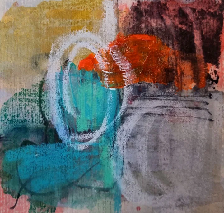 Teal merges with fiery orange across this spontaneous 10 x 10 cm paper piece. The delicate ink wash creates a halo effect, and there's a slight indentation from my heavy brush. A faint gray smudge adds softness to the boldness, while the thick paint catches light, revealing depth in the layers. Hand-painted original with a texture that invites you to touch. This piece brings back memories of summer afternoons filled with vibrant colors. It's perfect for brightening the wall above your bedside table. Ideal for anyone who loves lively, unique art that sparks joy. Ready to add warmth to your space.