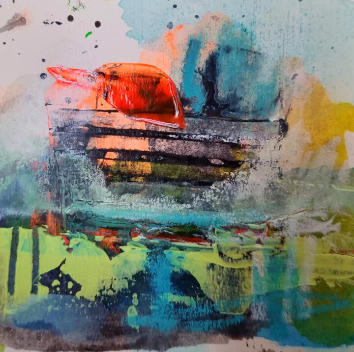 Vivid orange stands out against turquoise and lime green on this 10 x 10 cm paper. The heavy ink bleed creates an organic texture with a slight uneven stroke running through the center. Light catches the glossy paint, highlighting layers and casting playful shadows. Shapes blend yet maintain their integrity, creating a beautiful chaos. This hand-painted original invites touch. I started this on a lazy summer afternoon, capturing the vibrant spirit of those days. It evokes energy and movement. This 10 x 10 cm artwork would bring color and joy to an entryway nook, perfect for anyone seeking a splash of brightness in their lives. Ready to spark happiness every time you see it?