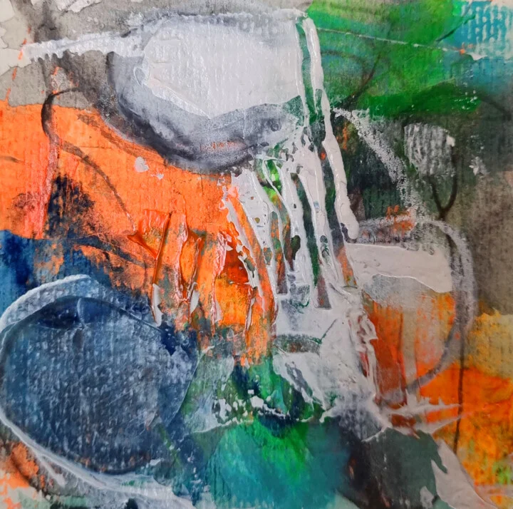 Bright greens meld with vibrant orange across this 10 x 10 cm paper. There's an uneven texture in the upper left where my brush slipped, leaving a wavy edge. A faint smudge hints at my excitement as I painted. The thick layers capture light, revealing depth, especially where white peeks through. Circular forms create a lively rhythm. Hand-painted original meant to be appreciated up close. I began this on a sunlit morning, inspired by nature's beauty. The colors evoke calm and energy. This 10 x 10 cm abstract would shine brightly above a bedside table, ideal for anyone wanting to add a dash of color and joy to their home. Dive in and make it yours!