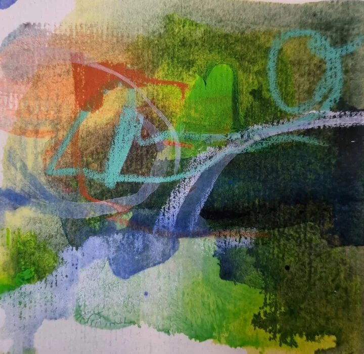 A vibrant mix of greens and oranges plays across this 10 x 10 cm paper painting. There’s a dynamic blur where I smudged the brush, creating a soft transition in color. The blue layer appears to glow, catching light and adding depth. Ink lines spiral in and out, providing playful contrasts. Each stroke stands out, giving the piece a raw yet balanced feel. Hand-painted original with all my unique imperfections. I began this on a sunny afternoon, inspired by the lush hues in my garden. It radiates warmth and energy, perfect for a creative workspace or as a striking accent. This 10 x 10 cm abstract would look beautiful above a small desk or in a cozy nook. Ideal for anyone who appreciates vibrant, unique art. I can’t wait for you to bring it home.
