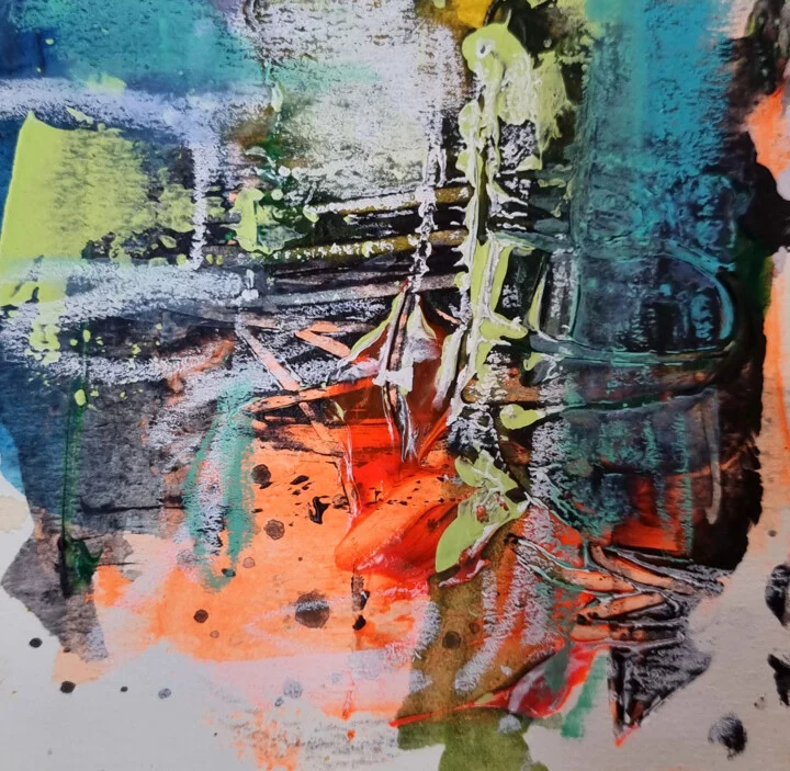 Energetic splashes of neon green and orange dance across this 10 x 10 cm paper artwork, creating a lively composition. A subtle ink bleed leads to dynamic interactions within the shapes, revealing layered depths of color. There are unintentional smudges along the edges, a testament to my process of capturing chaos. This hand-painted original invokes nature’s unpredictable essence and carries a palpable energy. Creating this piece brought back memories of summer days filled with wild colors. It invites imagination and whimsy. This 10 x 10 cm abstract would bring playful energy to a cozy reading nook, perfect for anyone who loves creativity. I’d love for you to experience its vibrant energy.