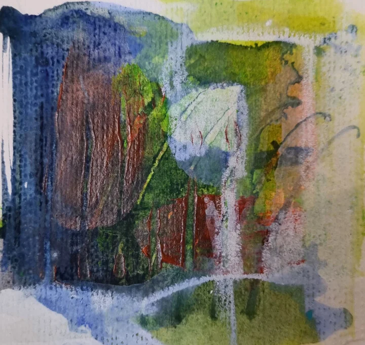 Vivid emerald greens collide with deep blues and burnt oranges in this 10 x 10 cm piece. Layering watercolor gives a distinct textural depth, enriching the forms. A faint smudge in the top left hints at the spontaneity of creation, marking a moment of adjustment. The painting catches light in dynamic ways, especially around the edges, creating a soft glow on the textured paper. Hand-painted original revealing a new facet with each brushstroke. I began this on a sunny afternoon, inspired by the lush scenery around me. It evokes a sense of calm and invites exploration. This 10 x 10 cm abstract would sit beautifully above a cozy reading nook. Ideal for anyone who appreciates vibrant textures on their walls. I'm excited for it to find its new home.