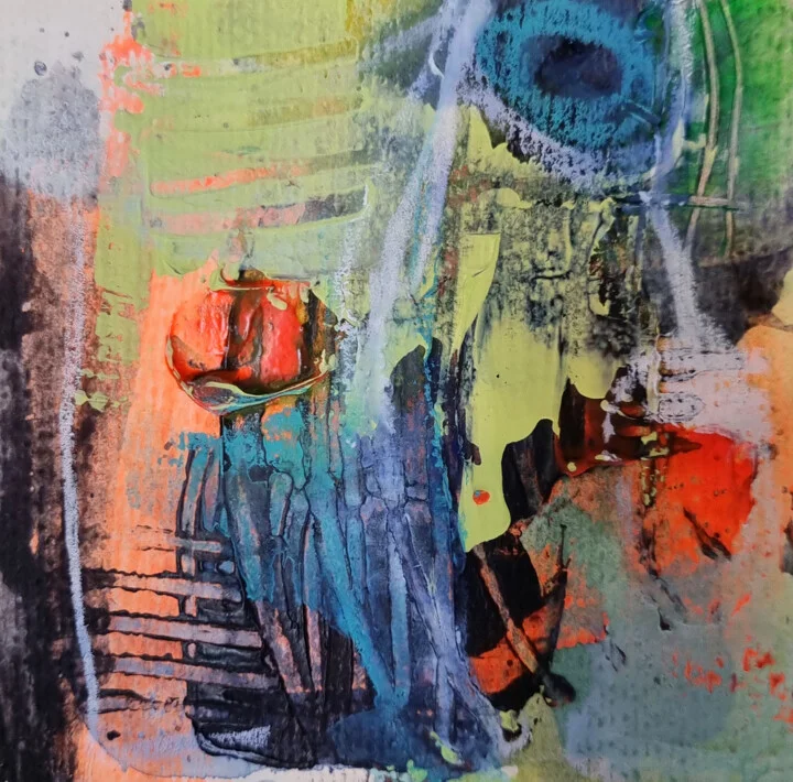 In this 10 x 10 cm artwork, bright crimson intermingles with deep teal and hints of green. I noticed a faint smudge in the lower left corner from my finger brushing the wet paint, adding a personal touch. The light catches the glossy surface, creating dynamic shadows that enhance the energetic textures. The expressive strokes from my brush bring a layered effect, inviting you to explore its depths. Hand-painted original with intense tactile quality. Creating this piece on a sunny afternoon sparked a joyful energy I wanted to share. This 10 x 10 cm abstract would be perfect for brightening a desk corner or a small gallery wall. It’s for anyone who craves a burst of lively color in their space. Let's make it yours!