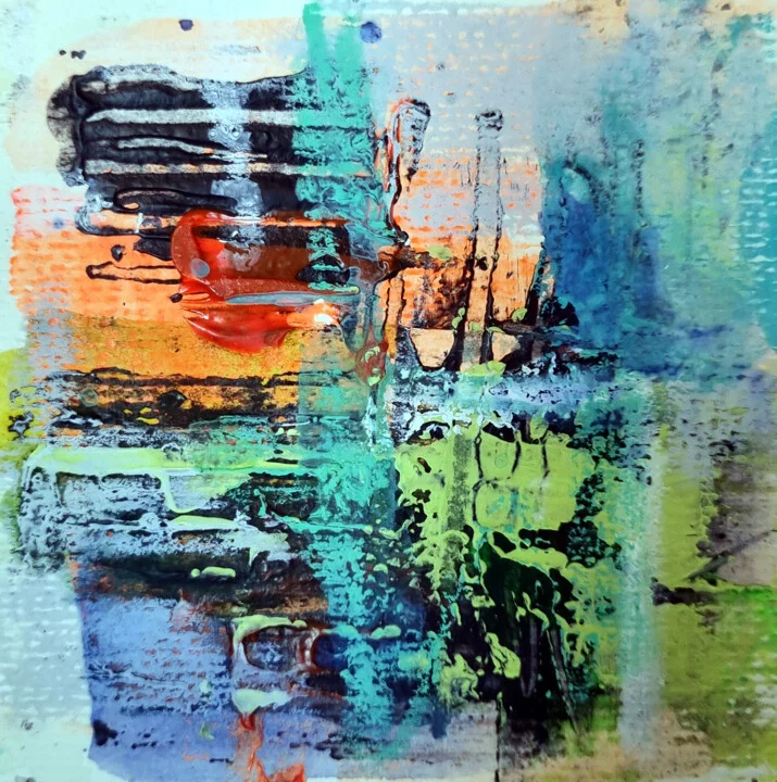 In this 10 x 10 cm piece, vibrant turquoise swirls mingle with warm orange hues. The textured layers create a tactile surface, with a faint smudge marking a transition of colors. The glossy areas catch light beautifully, creating a dynamic interplay. This piece embodies structured chaos, reminiscent of a sunny summer day, inviting you to explore its depths. Hand-painted original that captivates with its vivid energy. I painted this on a sunny afternoon, inspired by the warm summer light. It brings a bright and uplifting feeling to any space. This 10 x 10 cm abstract is a playful addition to a home office nook. Perfect for those who appreciate unique textures and vibrant shades. Ready to bring life to your walls?