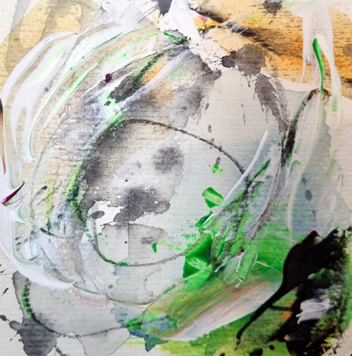 Swirls of bright greens and grays mingle on this 10 x 10 cm paper piece, a lively exploration of movement. Some green pigments have lightly smeared near the edges, adding a spontaneous feel. Subtle impressions left by my fingers while layering the wet paint create a tactile texture. Light reflects off the glossy areas, illuminating the vibrant sections while casting gentle shadows in the recesses. Hand-painted original that embodies summer's vibrancy. I started this in an open field, inspired by the lively greens of nature. It radiates joy and freshness. This 10 x 10 cm abstract would bring delightful energy to a small gallery wall in a hallway. It’s perfect for anyone who loves to splash color into their life. Ready to enrich your collection?