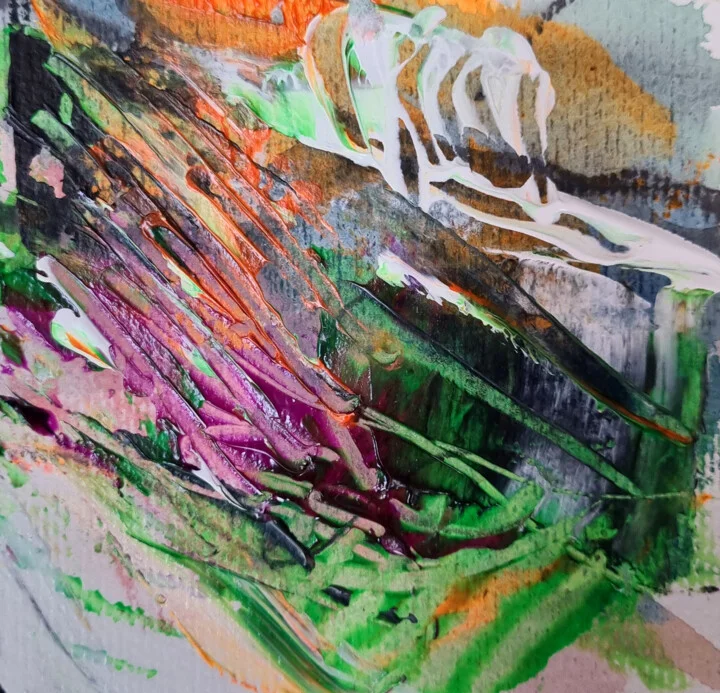 Emerald greens blend with vibrant oranges and hints of deep purple across this 10 x 10 cm piece. The textured paper captures the light, revealing gentle ridges left during my playful application. An uneven stroke in the bottom left corner adds a personal touch. The lively colors create depth, while bold lines dart across the canvas. Hand-painted original, filled with movement and life. I created this on a sunny afternoon, inspired by the wildflowers blooming. It evokes a playful spirit, perfect for brightening a cozy nook. This 10 x 10 cm abstract would be a delightful addition to your reading corner. For anyone who cherishes art that bursts with energy, I hope it fills your space with joy.