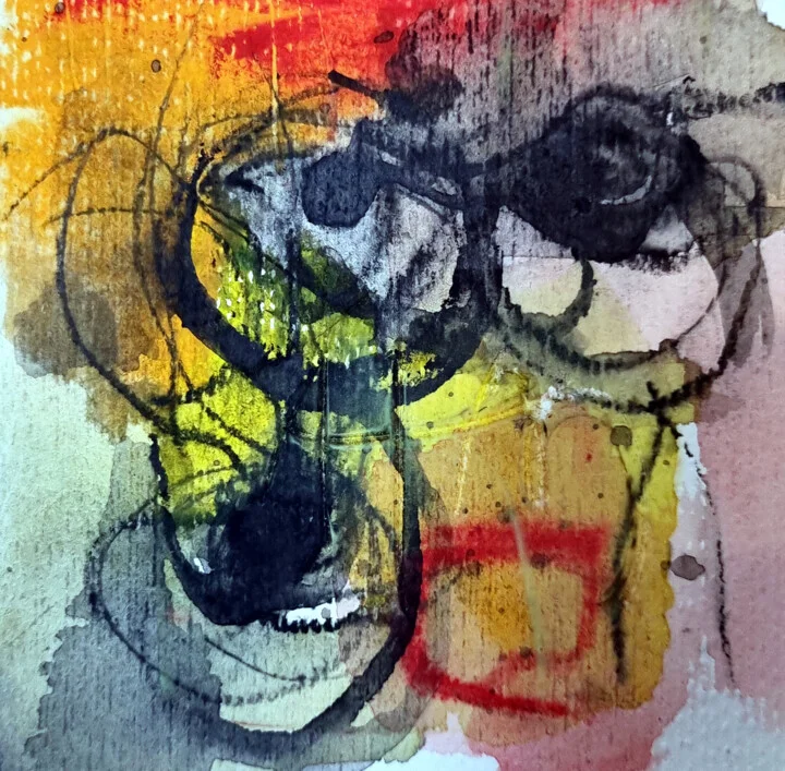 Burnt yellows flow into deep blacks and soft reds across this 10 x 10 cm watercolor. The lines curl and overlap, creating a vibrant dance of forms. A faint smudge in the lower right corner shows where I brushed the wet surface unintentionally. Light reflects on the textured paper, adding depth to the vivid colors. Fine brush tips contrast beautifully with richer, inky surfaces. Hand-painted original with spontaneous charm. I started this on a sunny afternoon, inspired by the light pouring through my window. This 10 x 10 cm abstract would bring playful energy to a small corner table in your home. Ideal for those who appreciate unique, handcrafted art with character. Ready to brighten your space?