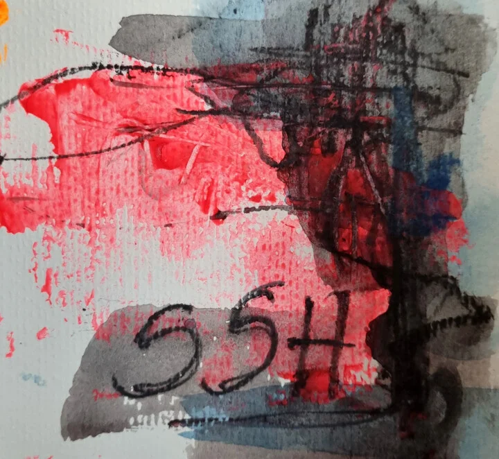 Rich crimson and deep grey blend in fluid strokes on this 10 x 10 cm watercolor piece. A thick line cuts across the canvas, and a slight lift at the bottom reveals the paper's fibrous texture. An uneven brush stroke on the left merges into a vibrant area where paint pools. Light dances across the surface, highlighting glimmers between reds and blacks. This hand-painted original invites close inspection to reveal its varied textures. I started this on a stormy afternoon, aiming to capture raw energy. This 10 x 10 cm piece would make a striking focal point above a small desk in your home office. It's perfect for anyone drawn to bold colors and emotional depth. I hope it finds a place in your space.