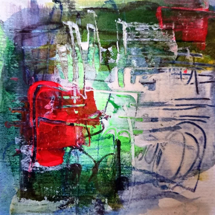 Vivid crimson swirls through lush greens in this 10 x 10 cm watercolor. A slight ink bleed in the lower left corner adds organic depth where the wet paint met the wet paper. The layered hues catch soft light, creating a radiant glow that shifts with the angle. Energetic lines dance across in chaotic rhythm, suggesting movement and spontaneity. This hand-painted original has a texture achievable only through the delicate balance of water and pigment. I started this on a warm summer afternoon, inspired by the colors around me. It's invigorating, almost alive. This 10 x 10 cm abstract would add a burst of energy to a small gallery wall in your living room. Perfect for someone who appreciates a lively pop of color amidst simpler decor. Let it bring a little vibrant chaos into your space.