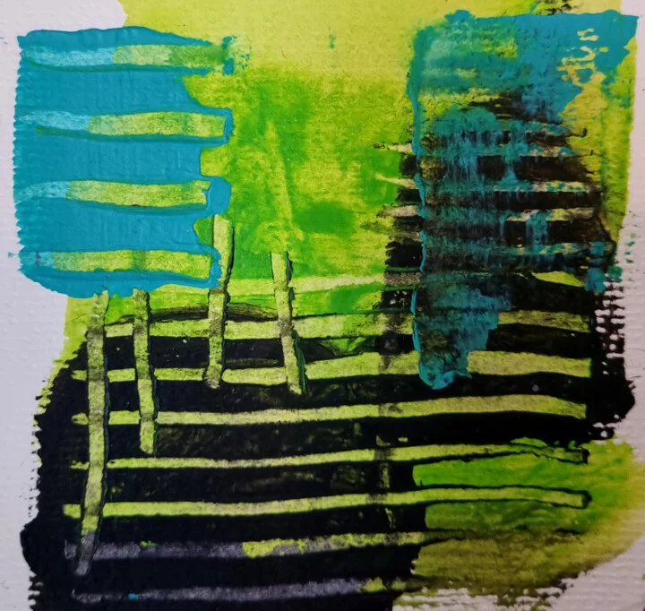 Vivid lime green interplays with dark black stripes on this 10 x 10 cm piece. I layered acrylic over ink to create a textured surface, where colors collide expressively. There's a small lifted edge at the bottom left, showcasing its handmade charm. Turquoise splashes catch the light, adding movement to the composition. This hand-painted original invites you into its unique texture. Painting this piece reminded me of the vibrant energy of summer. It brings a refreshing clarity, making it perfect above a desk, brightening your workspace with lively hues. It's for those who appreciate unique, textured art. I hope you'll consider adding it to your collection.