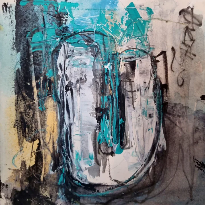 Vivid teal contrasts with rich blacks and soft grays in this 10 x 10 cm piece. There's a faint smudge near the top where my fingers brushed against wet ink, adding an organic feel. Thick acrylic catches the light, illuminating textures and making colors pop. A fluid shape emerges from the chaos, anchoring the composition. This hand-painted original draws you in with its adventurous spirit. I started this piece contemplating the ebb and flow of nature. It evokes a sense of mystery and imagination, making it ideal for above a small writing desk or cozy nook. Perfect for anyone who loves expressive art that invites thought. Come explore its depths.