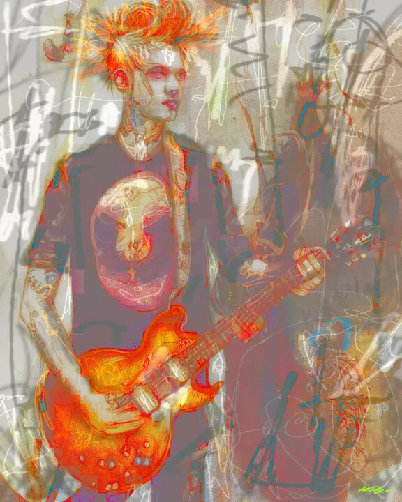 This digital artwork bursts with vibrant orange hues, depicting a punk-inspired figure radiating energy as they grip their guitar. The dynamic outlines and layers blend seamlessly into an abstract backdrop. You’ll find a slight texture discrepancy near the edge where I combined colors. The way light interacts with the layers creates a lively atmosphere. This is a print-ready digital file, perfect for canvas, fine art paper, or metal. Creating this piece brought back memories of the bold music scene I grew up with—it's filled with raw energy. The atmosphere is electric, resonating passionately with music lovers. Print this 38 x 48.3 cm artwork on high-quality metal for a striking focal point in your music room. It’s perfect for anyone who wants to celebrate the spirit of rebellion. Let me know when you’re ready to add this to your collection!