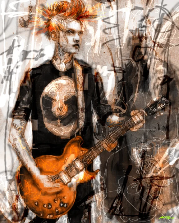 In this artwork, bright orange hues radiate from the guitar, set against muted browns and grays. The character’s tattoos spring to life within the layered composition, which creates depth and intrigue. A minor smudge on one edge adds character to the piece. The dynamic effects inject energy into the scene, making it captivating. This piece is print-ready, suitable for canvas, paper, metal, or acrylic. Creating this piece was about capturing the essence of rock and roll. The vibrant oranges resonate with passion and excitement. Print this 38.1 x 48.3 cm artwork on fine art paper for a bold statement in your music-themed room. It’s for anyone who wants a piece that speaks to their love for music. I'm here when you're ready to make it yours.
